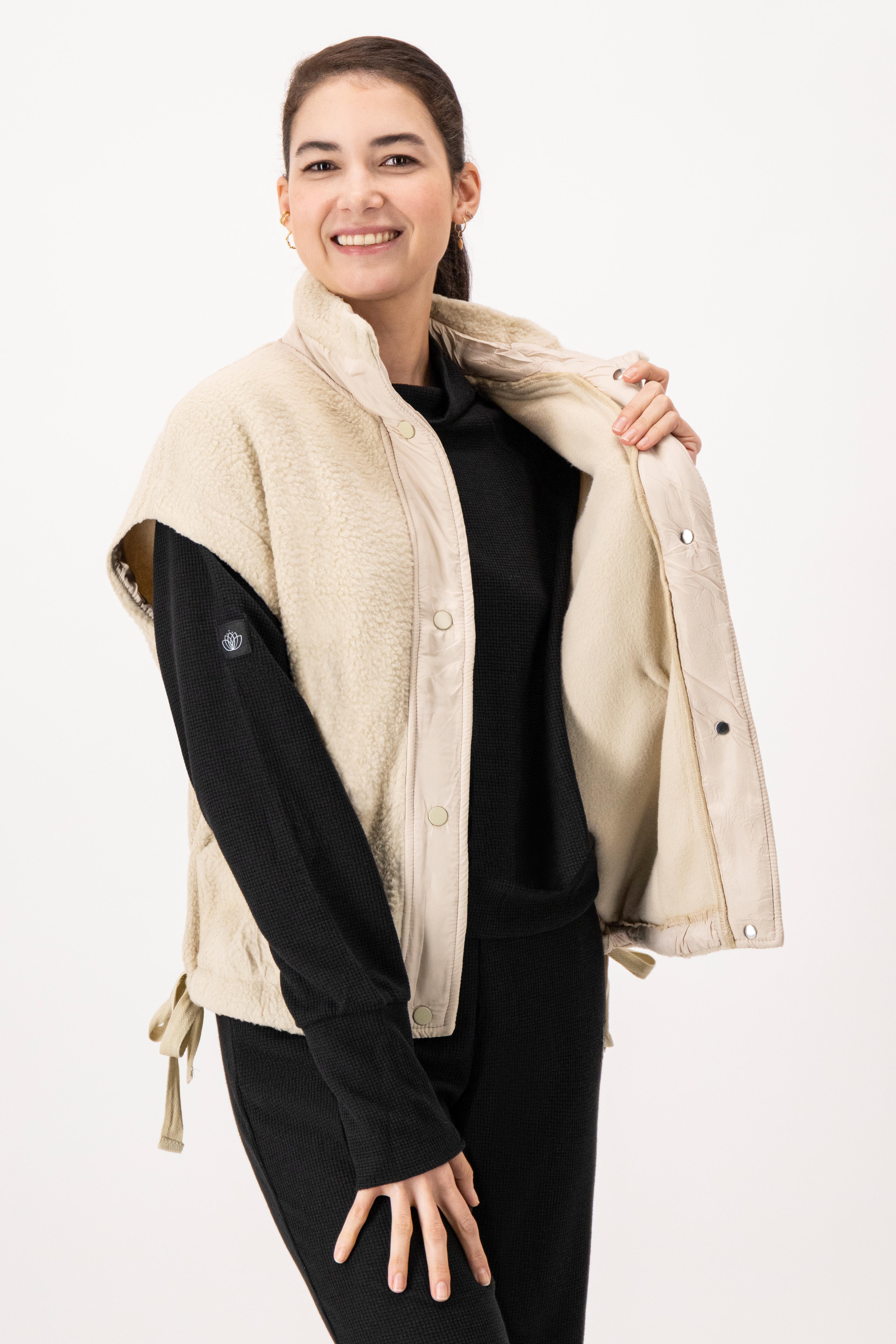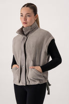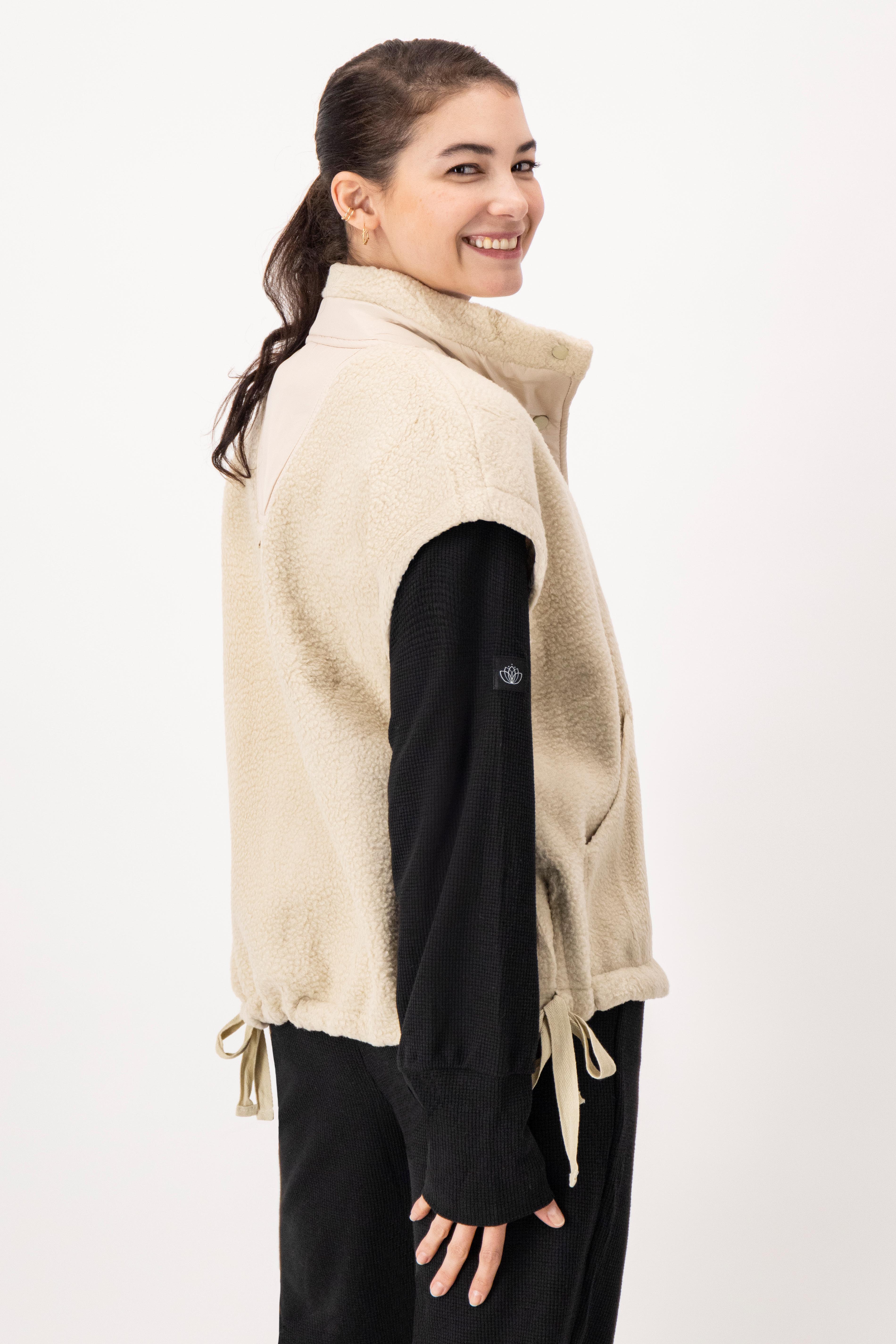 A soft, cozy layer designed for warmth and effortless style. This sleeveless sherpa vest features a high neck, snap-button closure, and adjustable side ties for a customizable fit. Its textured finish adds a touch of comfort and sophistication, making it the perfect piece to layer over your favorite long-sleeve tops or knits.